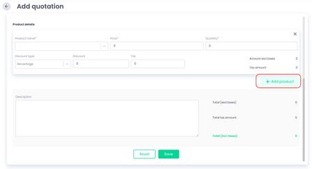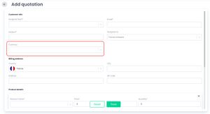 Une fois les champs "généraux" remplis, il vous suffit d'ajouter tous les produits que vous souhaitez insérer dans votre devis (en utilisant le bouton "Add product").