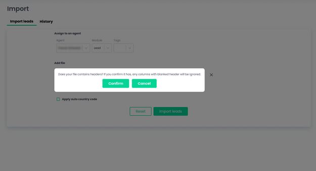 Il vous faudra ensuite sélectionner le fichier contenant les informations de vos prospect à l'aide du bouton "Select File". Si c'est un fichier CSV, il vous sera d'abord demander quel séparateur est utilise pour séparer les éléments de votre fichiers. Ensuite, que vous téléversiez un fichier CSV ou XLSX, il vous sera demandé si votre fichier comporte des entêtes:
