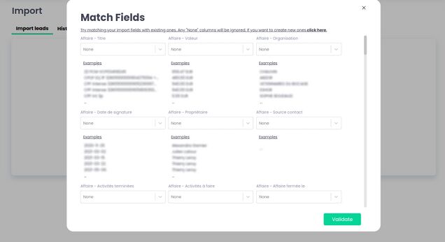 Une fenêtre apparaîtra alors, affichant les 5 premiers éléments de chaque colonnes de votre tableau, ainsi qu'en entête un sélecteur vous permettant de faire correspondre chaque colonne de votre tableau avec l'un des champs du module précédemment sélectionné.