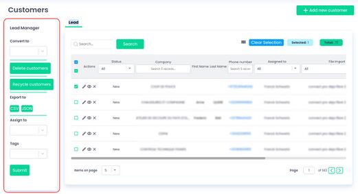 Cette action déclenchera l'apparition d'un nouveau menu contextuel, à gauche du tableau, permettant d'appliquer une action à plusieurs prospect, en chaîne.