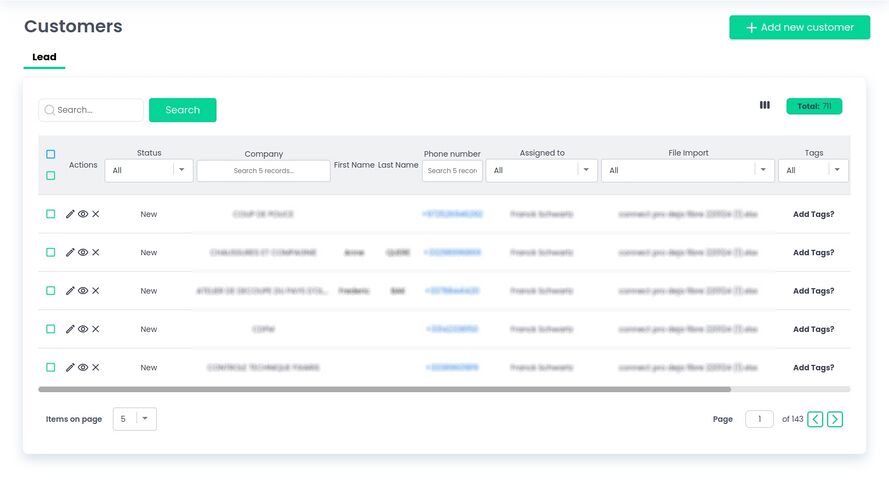 Dans cette section, vous allez pouvoir créer, supprimer, modifier, gérer les prospects se trouvant dans votre CRM.