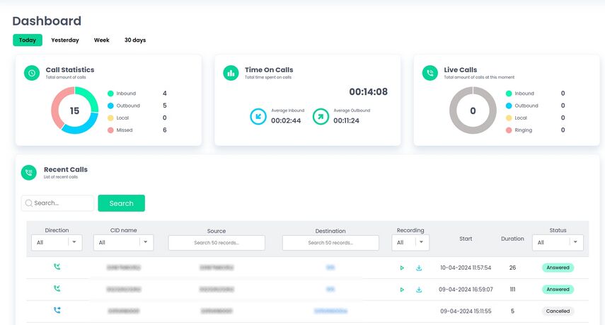 - Recent Calls: Ce tableau affiche la liste des appels passés pour la période sélectionnée (Affiche les 100 derniers appels maximum).