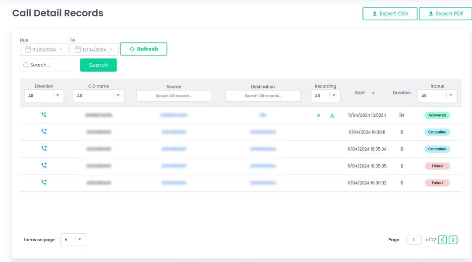 Ici, vous pourrez consulter la liste de vos appels, ainsi que les enregistrements associées (si ils existent). Vous avez également la possibilité d'exporter ces listings aux format CSV ou PDF.