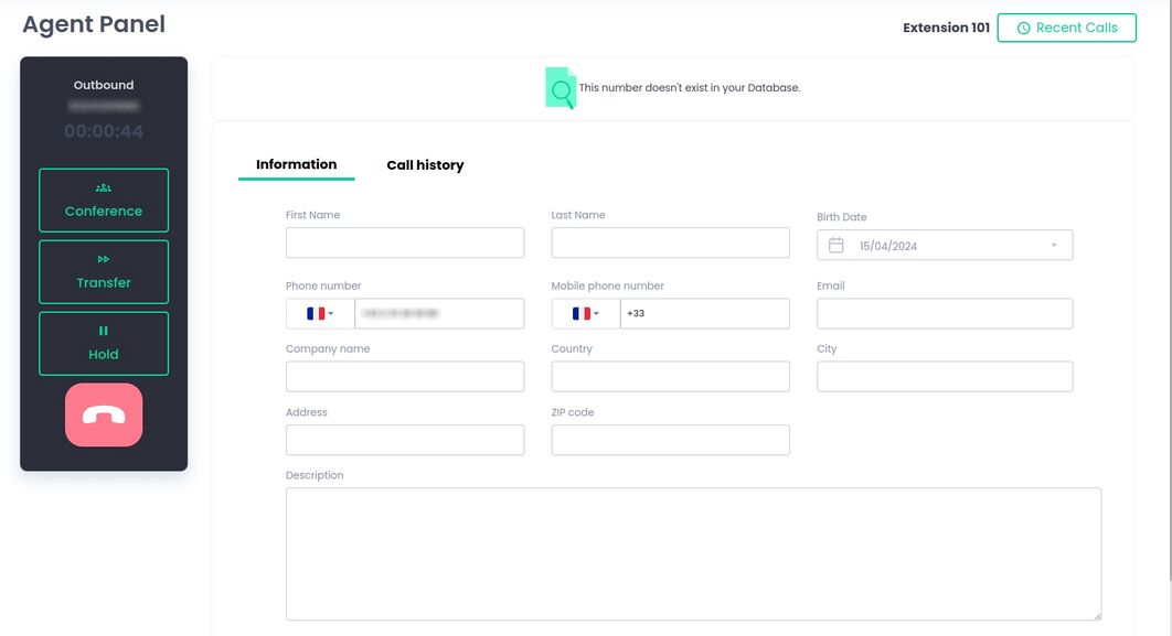 Lorsque l'extension associée a votre compte est en cours de communication, l'agent panel vous permet de collecter ou de visualiser les informations associer a ce numéro de téléphone ainsi que vos listings d'appels en rapport avec ce numéro. Dans le cas ou le numéro de téléphone n'est associée a personne dans votre système vous pourrez ici créer une nouvelle fiche cliente associée.