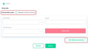 Si vous le souhaitez, vous pouvez également demander au système de convertir automatiquement le prix de référence (le premier défini) pour les autre devises en cliquant sur "Conversion Auto."
